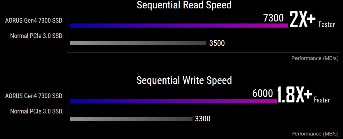 DĂky vyuĹľitĂ Ĺ™adiÄŤe Phison E18 a 3D TLC NAND pamÄ›ti nabĂzĂ disk AORUS Gen4 7300 SSD ohromujĂcĂ rychlosti: aĹľ 7 300 MB/s pro sekvenÄŤnĂ ÄŤtenĂ a aĹľ 6 000 MB/s pro sekvenÄŤnĂ zápis. VĂ˝kon sekvenÄŤnĂho ÄŤtenĂ diskĹŻ SSD s rozhranĂm PCIe 4.0 je dvakrát rychlejšà neĹľ u diskĹŻ SSD s rozhranĂm PCIe 3.0. PĹ™ipravte se na vstup do novĂ© generace vĂ˝poÄŤetnĂ techniky s rychlejšĂm a plynulejšĂm hranĂm her, streamovánĂm a graficky nároÄŤnĂ˝m vykreslovánĂm.
