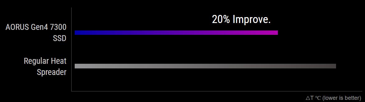 V porovnánĂ s běžnĂ˝m rozdÄ›lovaÄŤem tepla novĂ˝ vysoce účinnĂ˝ rozdÄ›lovaÄŤ zlepšuje odvod tepla a prodluĹľuje tak dobu provozu pĹ™i vysokĂ© rychlosti o 46 %. NavĂc ve srovnánĂ s diskem bez chladiÄŤe běžà AORUS Gen4 7300 SSD 5krát dĂ©le pĹ™i rychlosti 7,3 GB/s. UĹľijte si plynulejšà a vylepšenĂ˝ ĂşloĹľnĂ˝ vĂ˝kon.