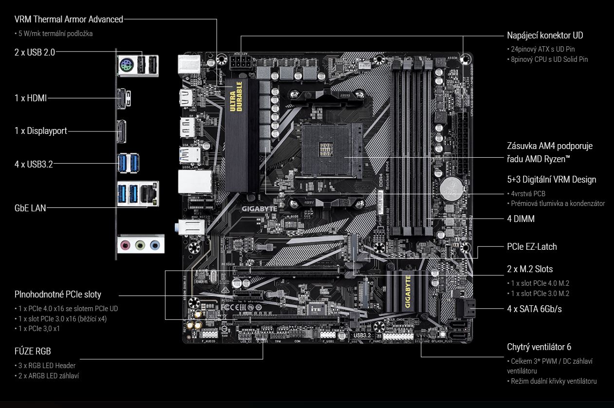 Podpora pro procesory: AMD Ryzen™ 5000 Series/Ryzen™ 5000 G-Series/Ryzen™ 4000 G-Series/Ryzen™ 4000 Series//Ryzen™ 3000 G-Series a Ryzen™ 3000 Series