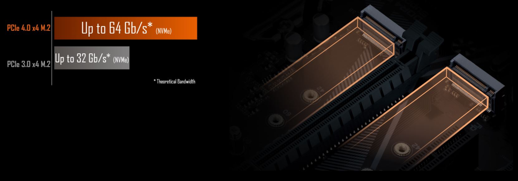 S vestavěnými konektory NVMe PCIe 4.0*/3.0 x4 a PCIe 3.0 x2 M.2 přinášejí základní desky GIGABYTE uživatelům možnost využívat připojení v režimu NVMe nebo v režimu SATA pro zařízení M.2 SSD. Díky rychlosti přenosu dat až 64 Gb/s poskytuje konstrukce dvojitých konektorů M.2 ideální řešení pro ukládání a zároveň podporuje v režimech RAID.