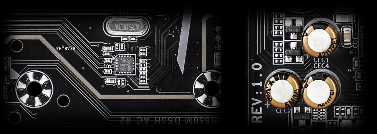 Základní desky GIGABYTE používají špičkové audio kondenzátory. Tyto vysoce kvalitní kondenzátory pomáhají poskytovat vysoké rozlišení a vysoce věrný zvuk a poskytují hráčům nejrealističtější zvukové efekty.