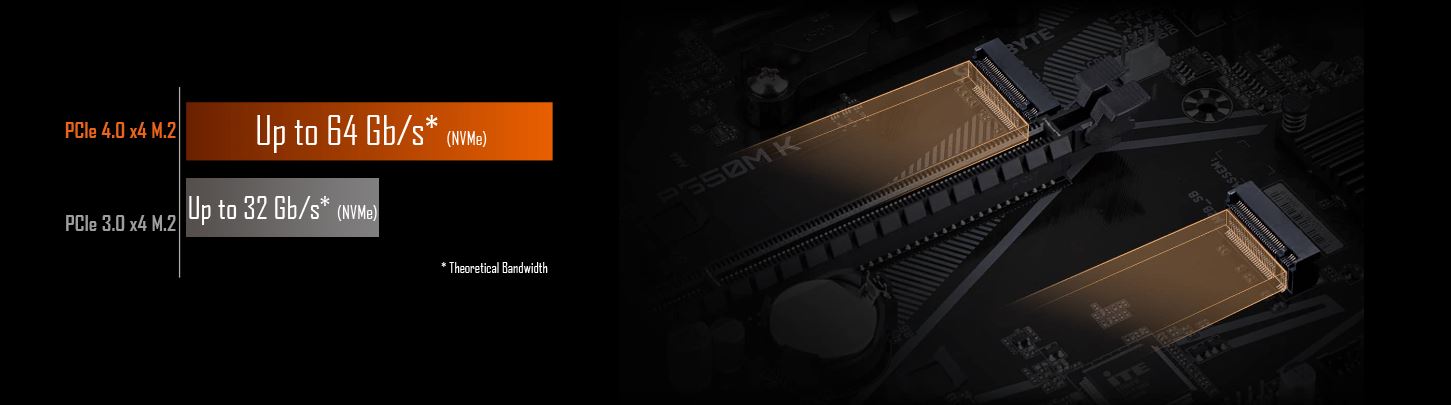 Díky konektorům NVMe PCIe 4.0/3.0 x4 a PCIe 3.0 x2 M.2 na desce přinášejí základní desky GIGABYTE uživatelům možnost připojení zařízení M.2 SSD v režimu NVMe nebo SATA. Konstrukce se dvěma konektory M.2 poskytuje rychlost přenosu dat až 64 Gb/s a je ideálním řešením pro ukládání dat a zároveň podporuje režimy RAID.