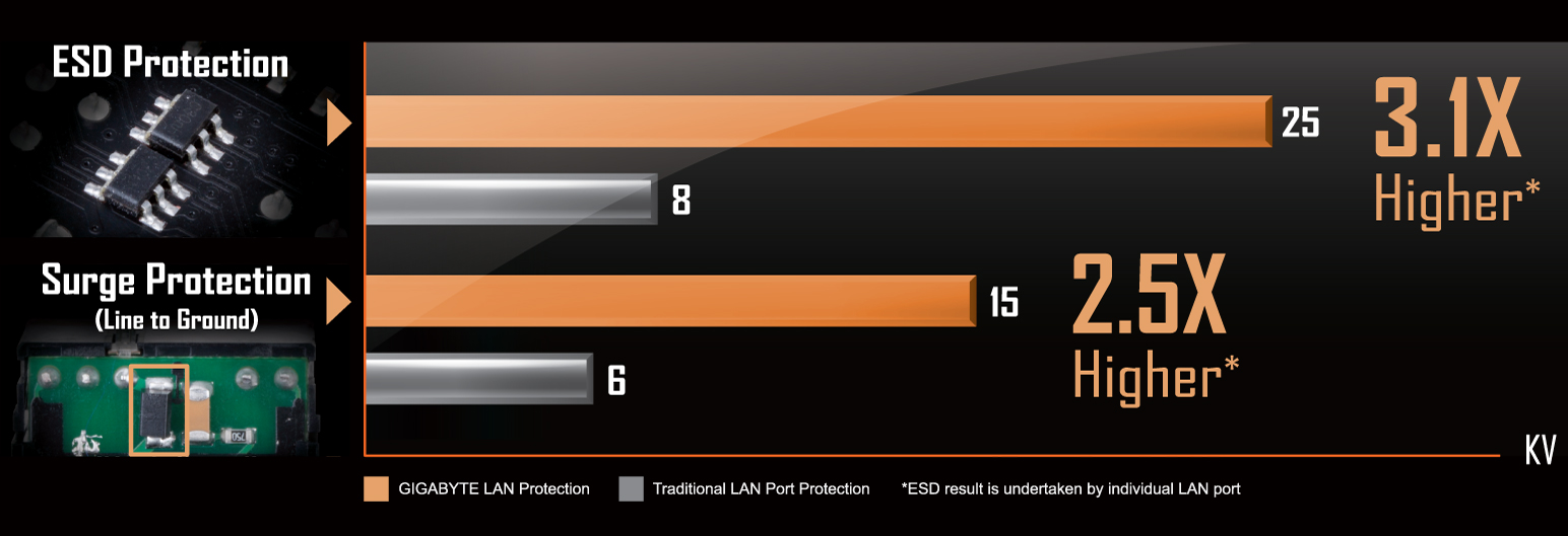 Základní desky GIGABYTE používají integrované obvody s až 3násobnou odolností proti elektrostatickému výboji ve srovnání s tradičními integrovanými obvody. To pomáhá lépe chránit základní desku a její komponenty před možným poškozením způsobeným statickou elektřinou. Základní desky GIGABYTE jsou také vybaveny speciálními integrovanými obvody proti přepětí, které chrání základní desku a váš počítač před případným přepětím v dodávce energie, což pomáhá zajistit, aby byl váš počítač vybaven pro případné nepravidelné a nekonzistentní dodávky energie.
