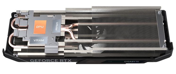 Měděná deska je v přímém kontaktu s GPU a je spojena s kompozitními měděnými tepelnými trubicemi, které rychle přenášejí teplo z GPU a VRAM do chladiče.