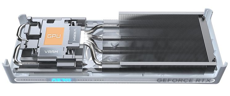 Měděná deska se přímo dotýká grafického procesoru a ve spojení s kompozitními měděnými tepelnými trubicemi rychle přenáší teplo z grafického procesoru a VRAM do chladiče.