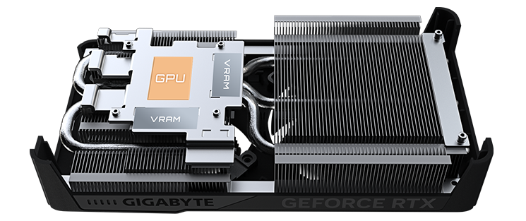 Měděná deska se přímo dotýká grafického procesoru a ve spojení s kompozitními měděnými tepelnými trubicemi rychle přenáší teplo z grafického procesoru a VRAM do chladiče.