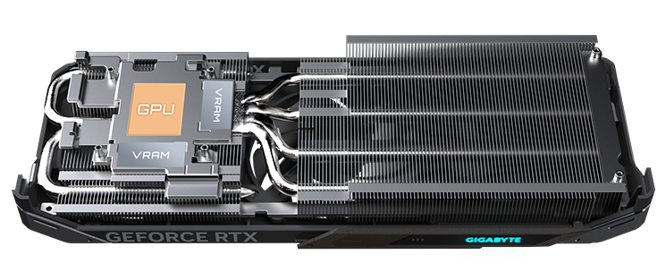 Měděná deska se přímo dotýká grafického procesoru a ve spojení s kompozitními měděnými tepelnými trubicemi rychle přenáší teplo z grafického procesoru a VRAM do chladiče.