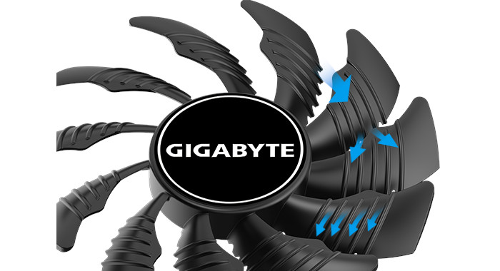Snižte turbulence sousedních ventilátorů a zvyšte tlak vzduchu. Společnost GIGABYTE otáčí sousední ventilátory v opačném směru, takže směr proudění vzduchu mezi oběma ventilátory je stejný, čímž se snižuje turbulence a zvyšuje tlak vzduchu.