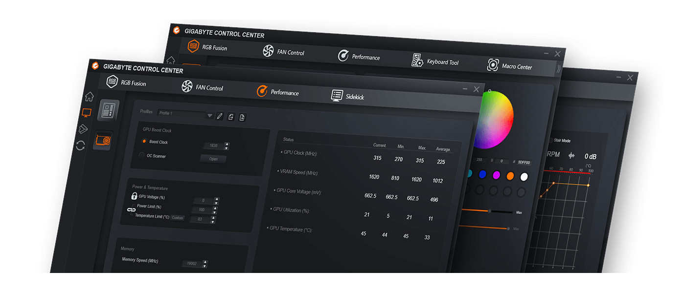 GIGABYTE CONTROL CENTER (GCC) je jednotný software pro všechny podporované produkty GIGABYTE. Poskytuje intuitivní rozhraní, které uživatelům umožňuje nastavit taktovací frekvenci, napětí, režim ventilátoru a cílové napájení v reálném čase.