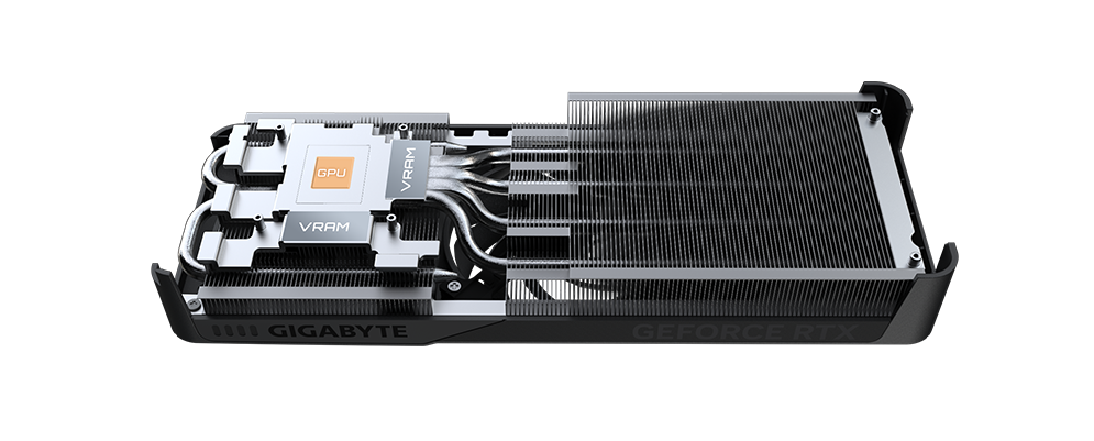Měděná deska je v přímém kontaktu s GPU a spolu s kompozitními měděnými tepelnými trubicemi rychle přenáší teplo z GPU a VRAM do chladiče.