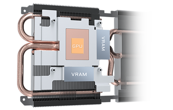 MÄ›dÄ›ná deska je v pĹ™ĂmĂ©m kontaktu s GPU a spolu s kompozitnĂmi mÄ›dÄ›nĂ˝mi tepelnĂ˝mi trubicemi rychle pĹ™enášà teplo z GPU a VRAM do chladiÄŤe.