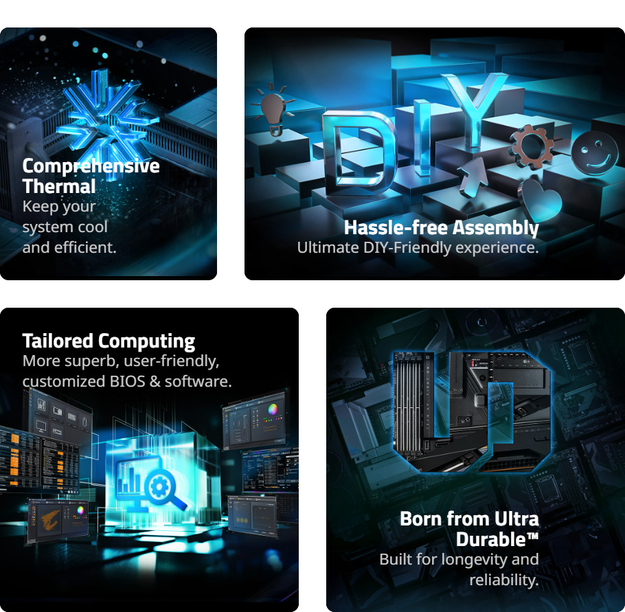 Základní desky GAMING jsou vybaveny pokročilou celokovovou tepelnou konstrukcí a odolnými chladiči, které udržují váš systém chladný a výkonný.