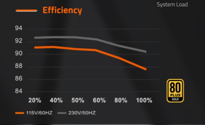Certifikace 80 Plus Gold zajišťuje 90% účinnost při 50% zatížení. Lepší energetická účinnost vede k menšímu plýtvání energií, menšímu teplu a menšímu hluku ventilátoru.