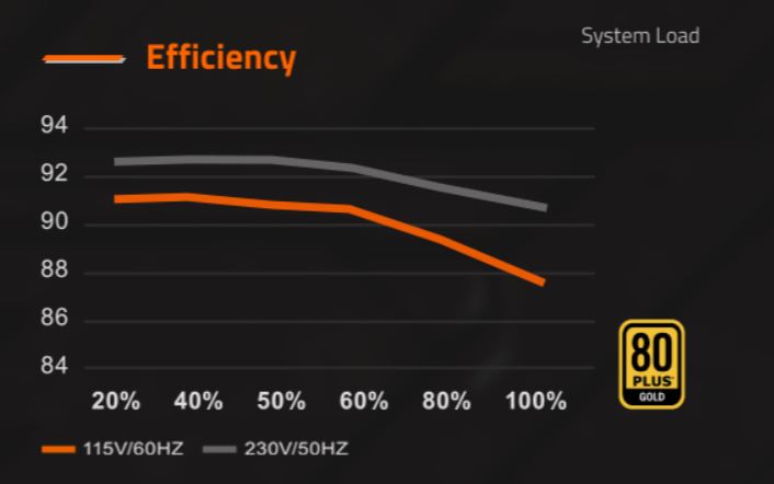 Certifikace 80 Plus Gold zajišťuje 90% účinnost při 50% zatížení. Lepší energetická účinnost vede k menšímu plýtvání energií, menšímu teplu a menšímu hluku ventilátoru.