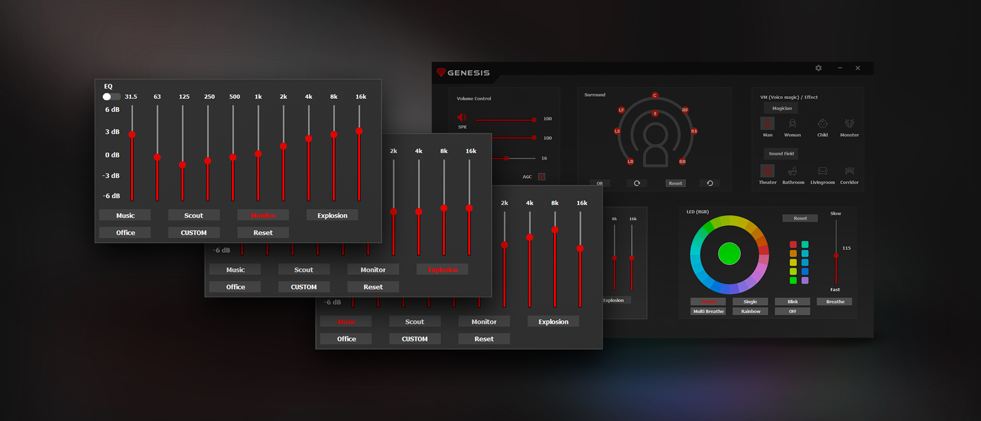 Kvalitní zvuková karta je jedna věc. Vedle ní vám sluchátka GENESIS Neon 764 umožní si zvuk přizpůsobit. Stačí použít vestavěné profily, které jsme vytvořili pro konkrétní aplikace. Chcete efektivněji lokalizovat protivníky ve hrách FPS? Předvolba "Scout" zvýrazňuje zvuky kroků. Soustředíte se na akci a raději si vychutnáváte každý výbuch? Předvolba 'Explosion' je pro to ideální. Nebo si jednoduše odpočiňte při zvucích své oblíbené kapely. Nastavení 'Hudba' vám poskytne ten nejlepší zážitek. Navíc si díky rozsáhlému ekvalizéru můžete snadno vytvořit vlastní zvuk, který uložíte do vybraného profilu.