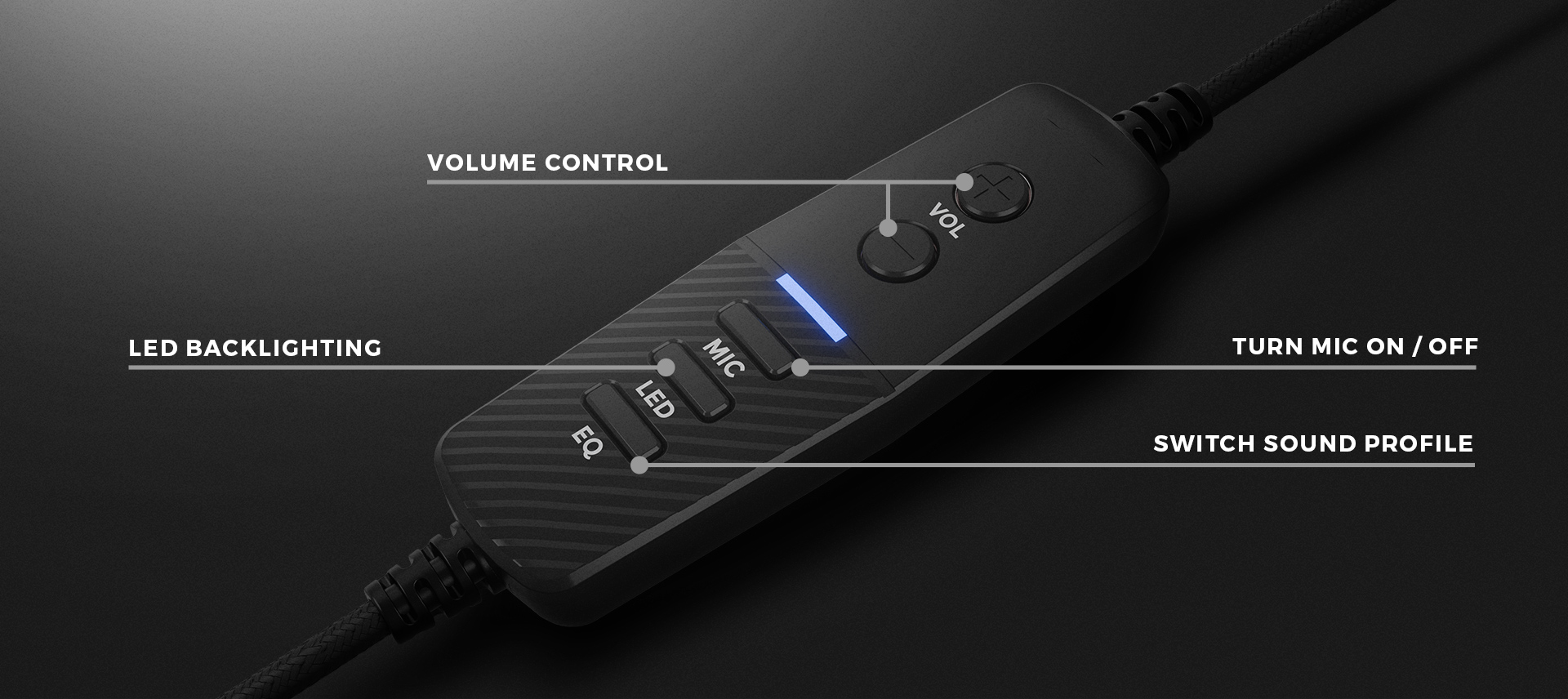 Víme, jak je pro hráče důležité používat další funkce. Proto jsme malý řadový ovladač vybavili funkcemi, díky kterým máte ty nejdůležitější na dosah ruky. Nastavte si podsvícení náušníků, upravte hlasitost, zapněte a vypněte mikrofon, přepínejte mezi dostupnými zvukovými profily, to vše během chvilky.