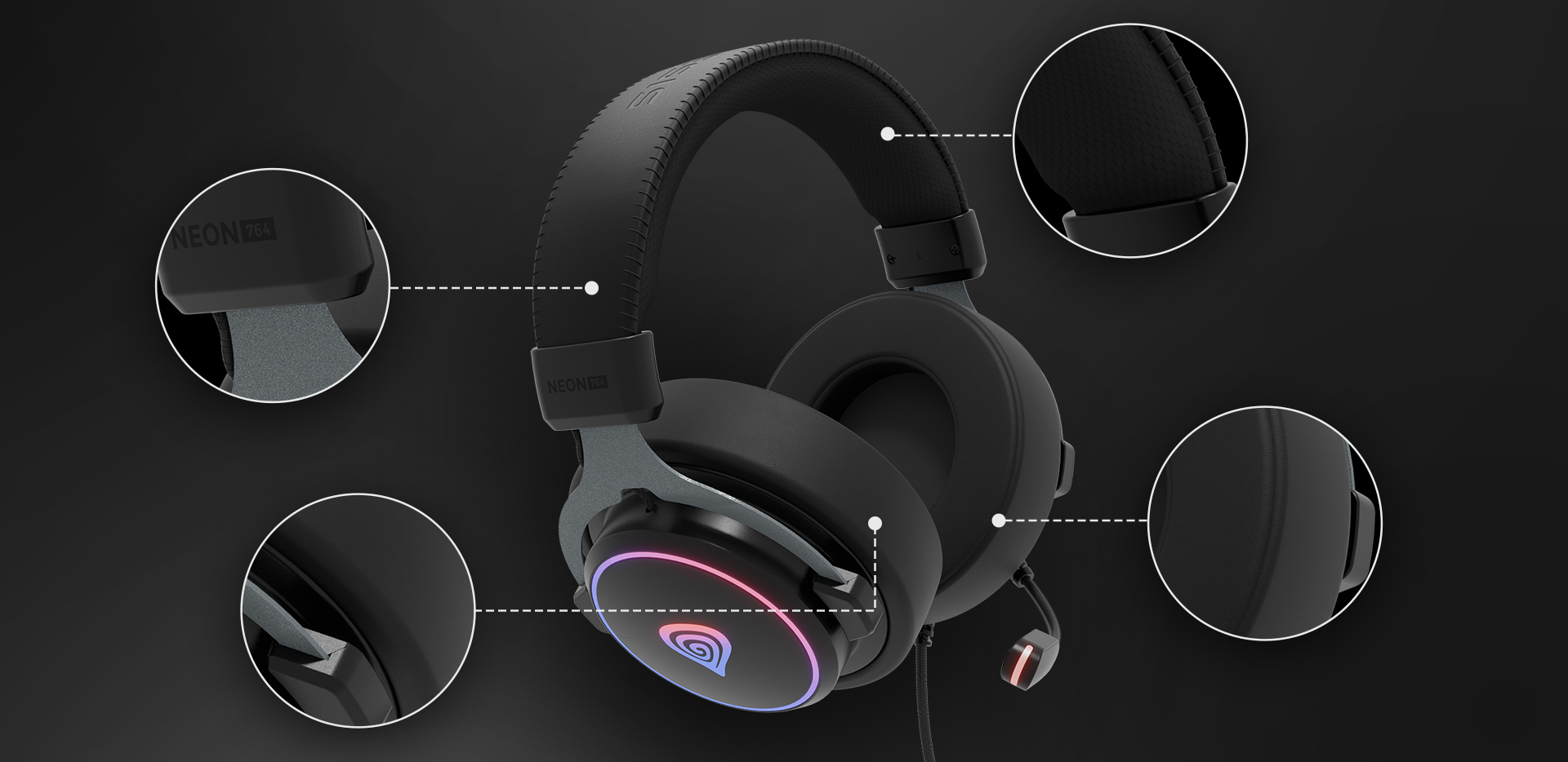 Jsou tak pohodlné, že možná zapomenete, že je vůbec máte na hlavě. GENES Neon 764 nabízí osvědčená řešení a materiály, které vám zpříjemní hodiny hraní. Velké a měkké náušníky, na dotek příjemná tkanina umístěná na vnitřní straně čelenky a stupňovité nastavení. Pohodlná a odolná - taková jsou sluchátka GENESIS Neon 764.