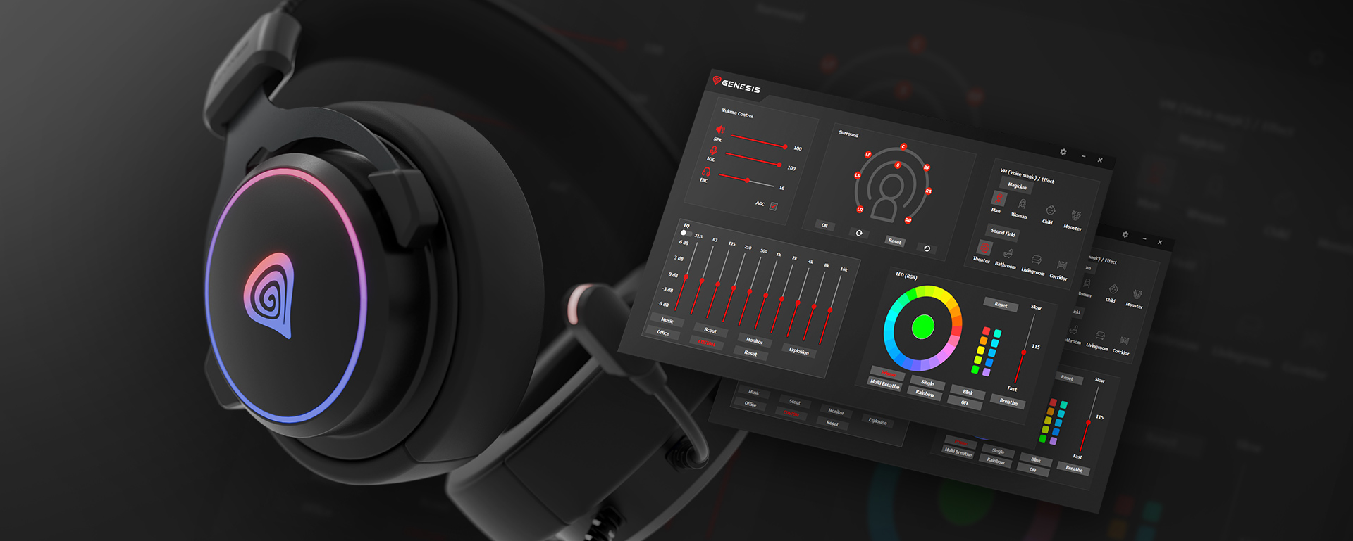 Speciální software GENESIS Neon 764 umožňuje nejen upravovat zvuk nebo aktivovat virtuální zvuk 7.1, ale také spravovat nastavení mikrofonu - včetně automatického řízení zisku (AGC) nebo redukce okolního hluku (ENC). Dejte o sobě vědět a svobodně komunikujte s GENESIS Neon 764.