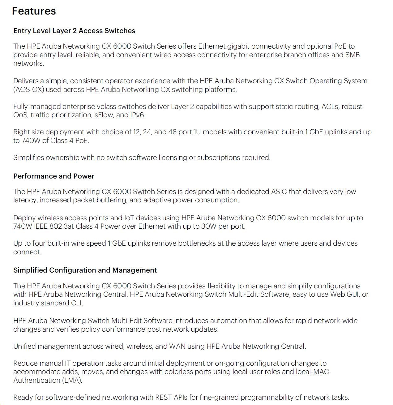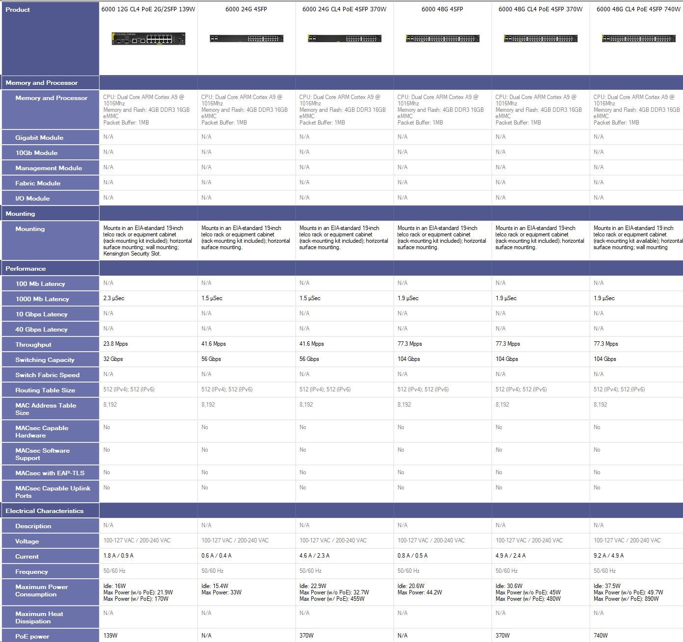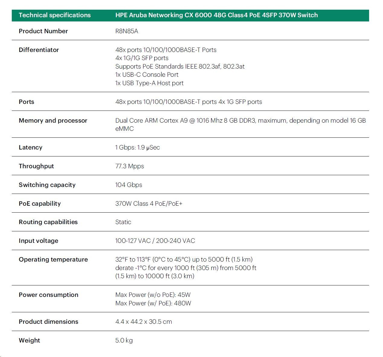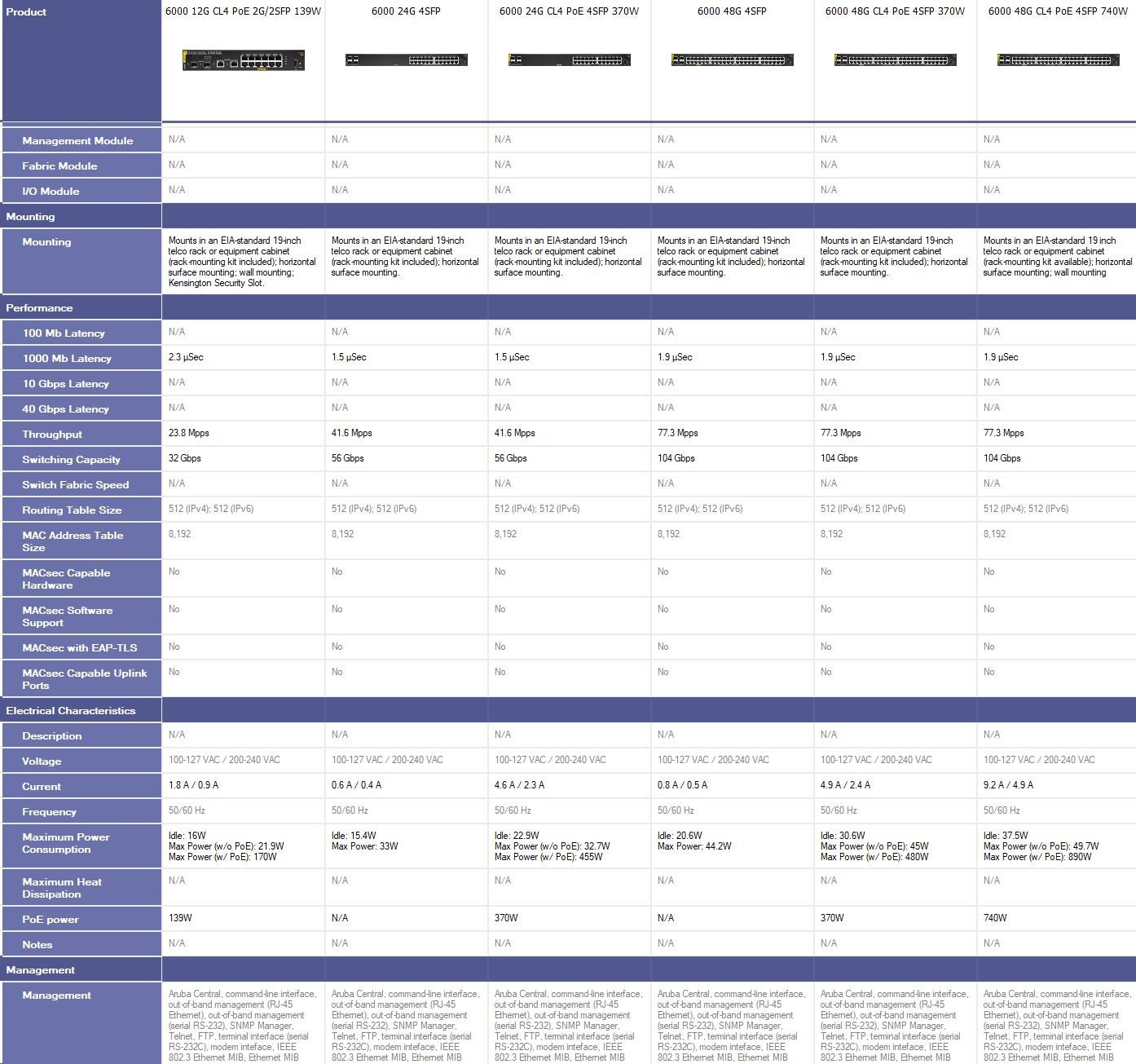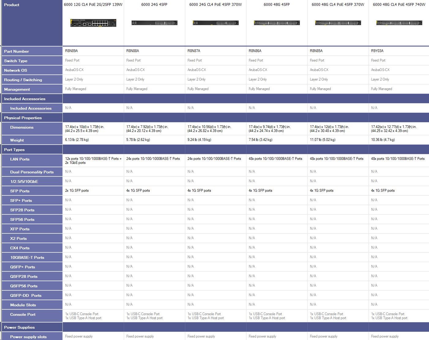 | Aruba 6000 48G Class4 PoE 4SFP 370W Switch (R8N85A) | Aruba 6000 48G 4SFP Switch (R8N86A) | Aruba 6000 24G Class4 PoE 4SFP 370W Switch (R8N87A) | |