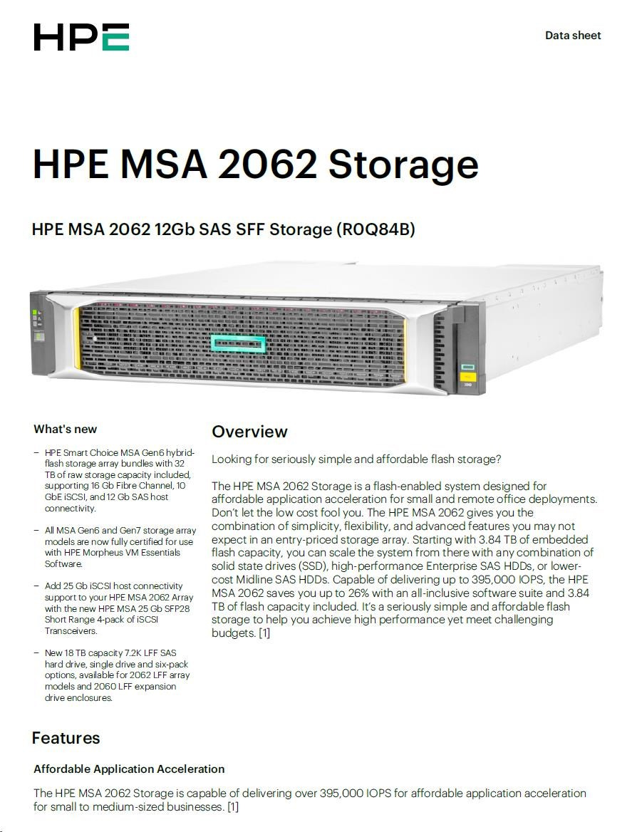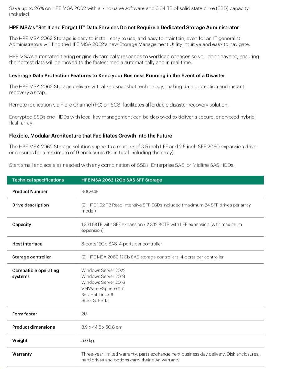 HPE MSA 2062 12Gb SAS SFF Storage  Includes an MSA 2060-branded LFF or SFF array chassis depending on model, two MSA 2060 controllers, two 1.92TB Read Intensive SSDs, One Advanced Data Services LTU, two AC power supplies, two .7m PDU cords (IEC C14), one rack-mount kit..