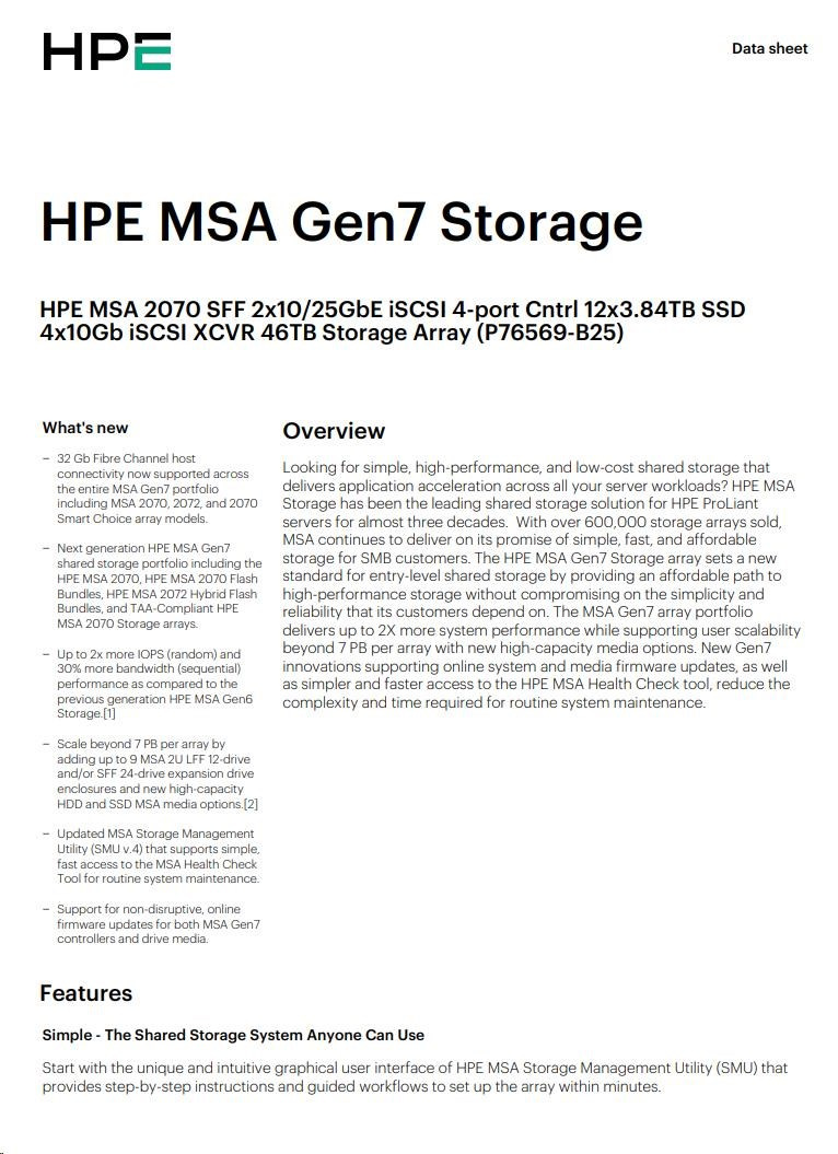 HPE MSA 2070 SFF 2x10/25GbE iSCSI 4-port Cntrl 12x3.84TB SSD 4x10Gb iSCSI XCVR 46TB Storage Array Smart Choice