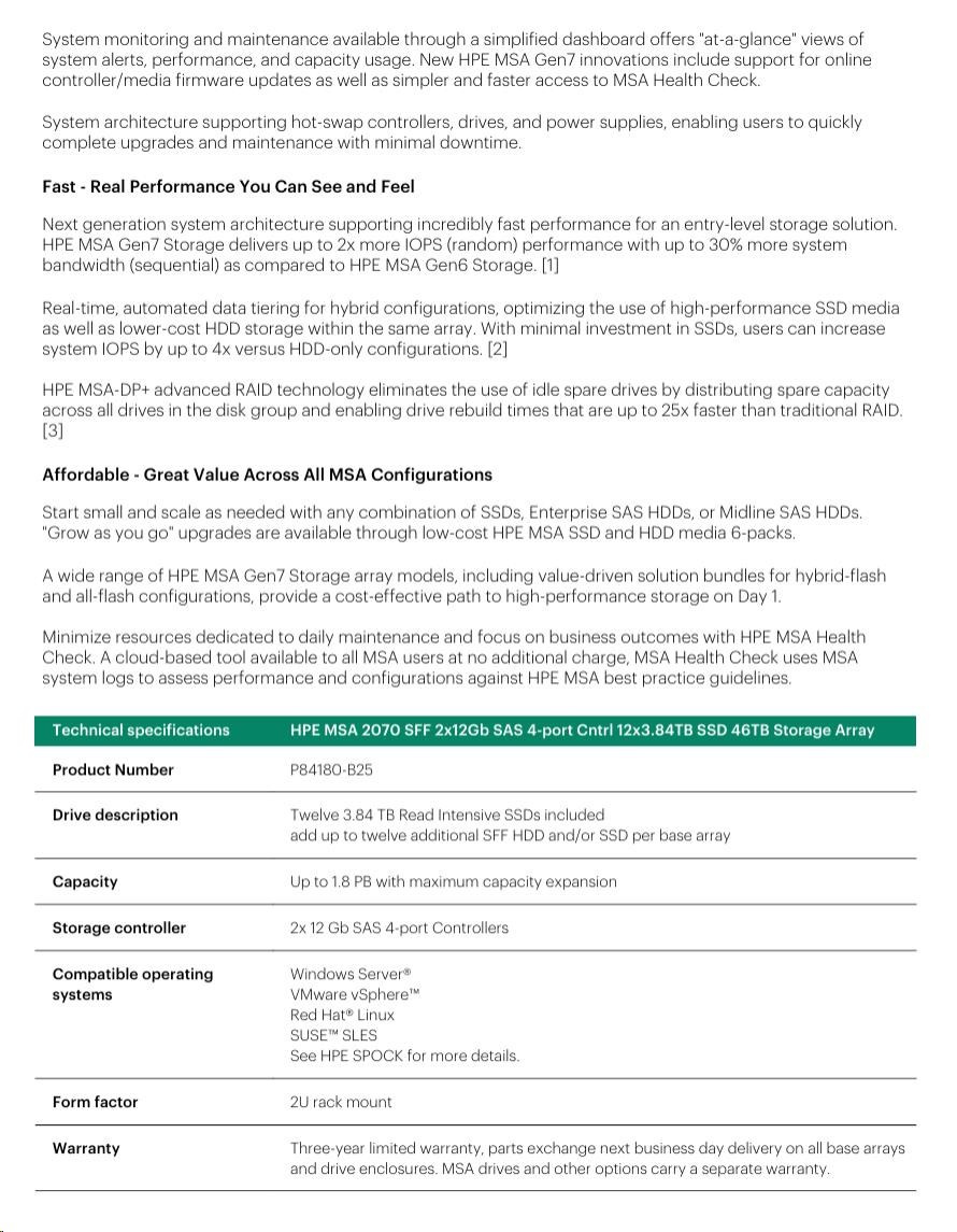 HPE MSA 2070 SFF 2x12Gb SAS 4-port Controller 12x3.84TB SSD 46TB Storage Array Smart Choice.