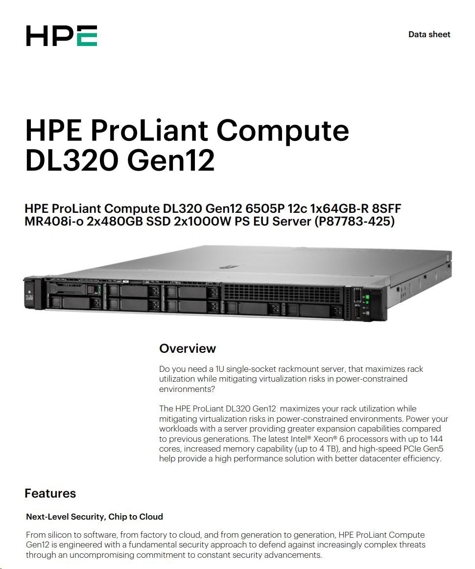 The HPE ProLiant DL320 Gen12 maximizes your rack utilization while mitigating virtualization risks in power-constrained environments. Power your workloads with a server providing greater expansion capabilities compared to previous generations. The latest Intel® Xeon® 6 processors with up to 144 cores, increased memory capability (up to 4 TB), and high-speed PCIe Gen5 help provide a high performance solution with better datacenter efficiency.