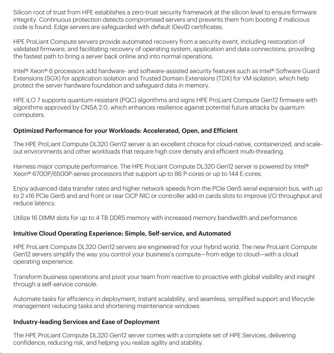 The HPE ProLiant Compute DL320 Gen12 server is an excellent choice for cloud-native, containerized, and scale-out environments and other workloads that require high core density and efficient multi-threading.