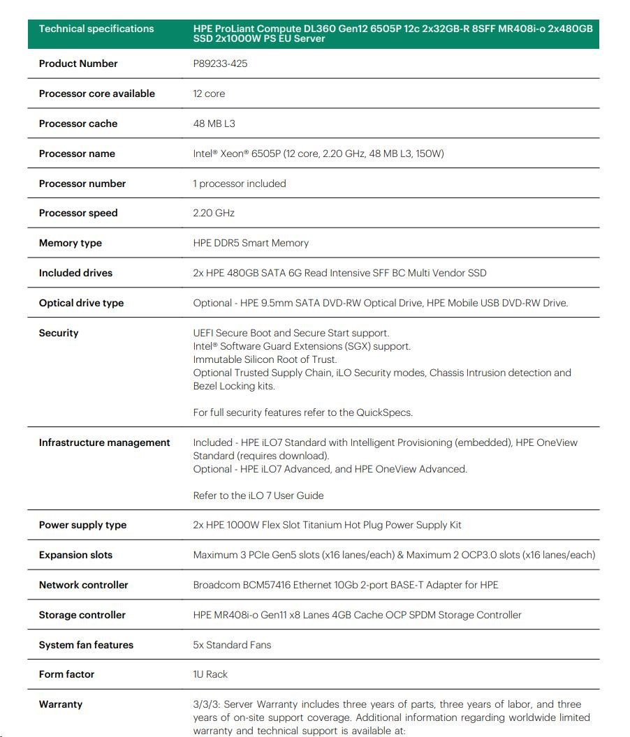 HPE PL DL360 Gen12 6505P (2.2/12C) 2x32G (P69727) 2x480G MR408i-o 8SFF 2x1000W 10GbE NBD333 Smart ChoicePE ProLiant Compute DL320 Gen12 Datasheet