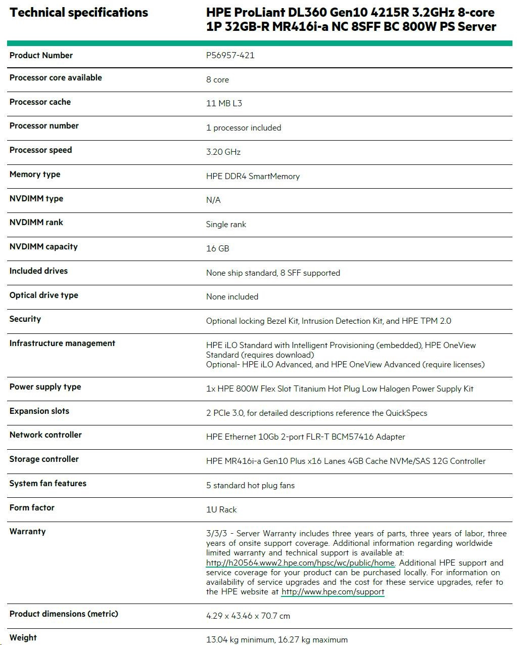 |   Model Name  |    HPE ProLiant DL360 Gen10 4215R 3.20GHz 8-core 1P 32GB-R MR416i-a NC 8SFF BC 800W PS Server  |