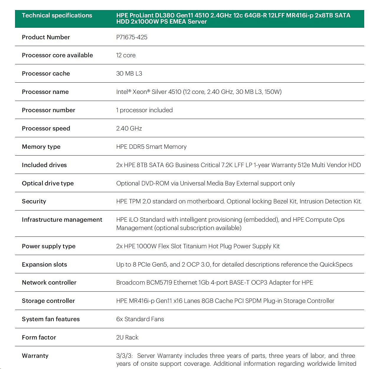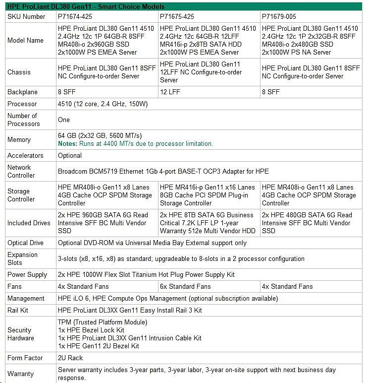 Model Name HPE PL DL380g11 4510 (2.4/12C/30M) 2x32G 2x8TB 2x1000W MR416i-p 12LFF 4x1Gb NBD333 2U