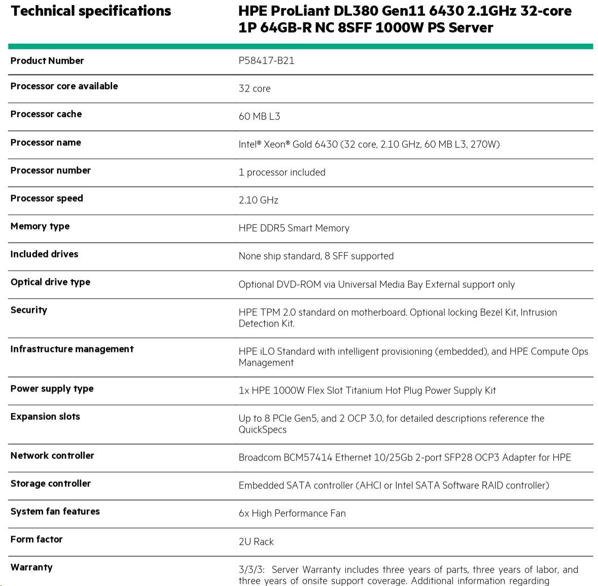 Model Name HPE ProLiant DL380 Gen11 6430 2.1GHz 32-core 1P 32GB-R NC 8SFF 1000W PS Server