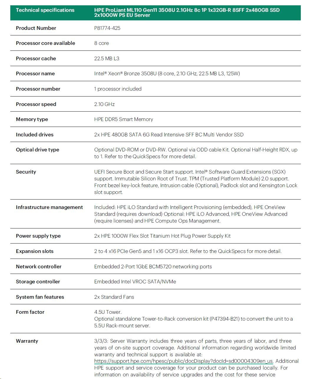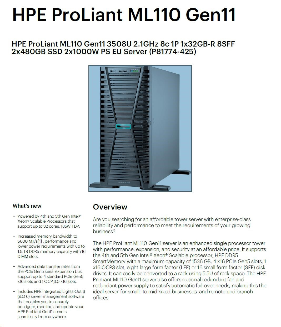 |   Model Name  |    HPE ProLiant ML110 Gen11 3508U 2.1GHz 8c 1P 1x32GB-R 8SFF 2x480GB SSD 2x1000W PS EU Server  |