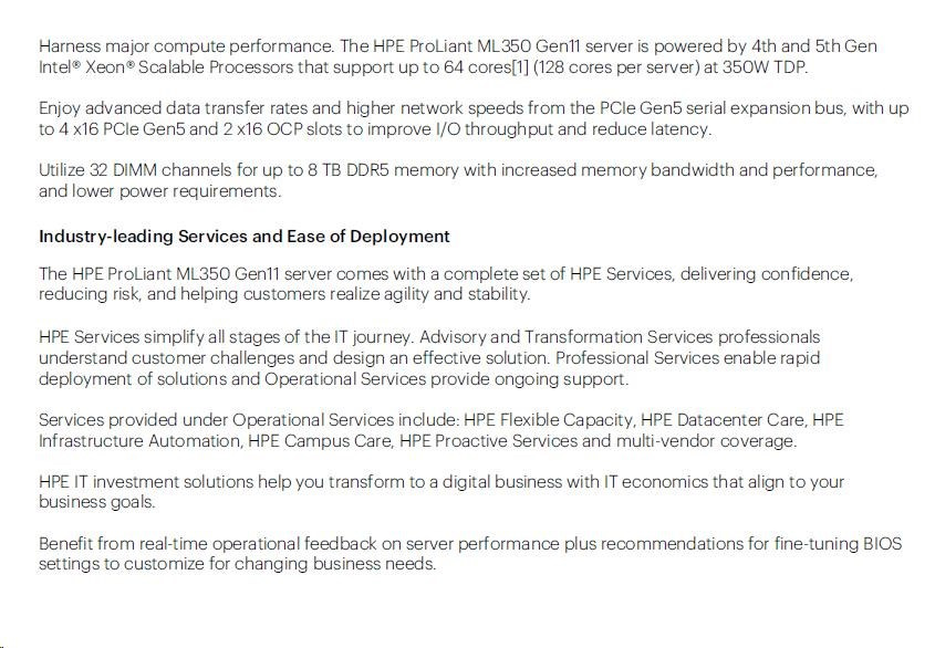 | Chassis | HPE ProLiant ML350 Gen11 SFF Configure-to-order Server |