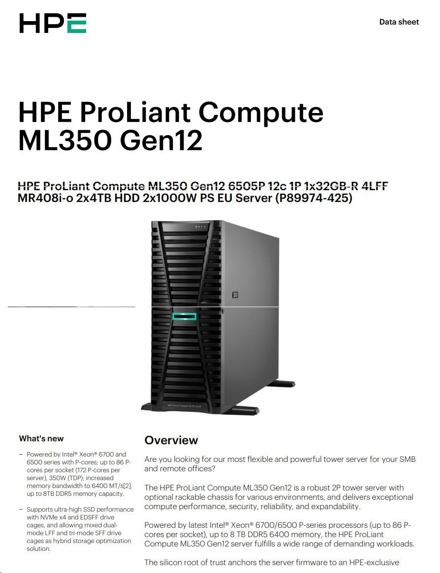 HPE PL ML350g12 6505P (2.2/12C) 1x32G (P69727) 2x4TB 4LFF MR408i-o2x1000W 1GbE NBD333 Smart Choice