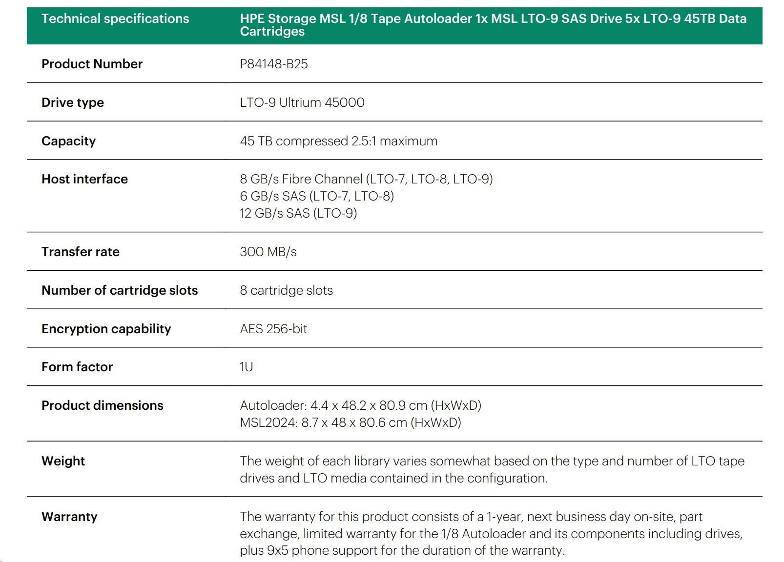 HPE Storage MSL 1/8 Tape Autoloader 1x MSL LTO-9 SAS Drive 5x LTO-9 45TB Data Cartridges