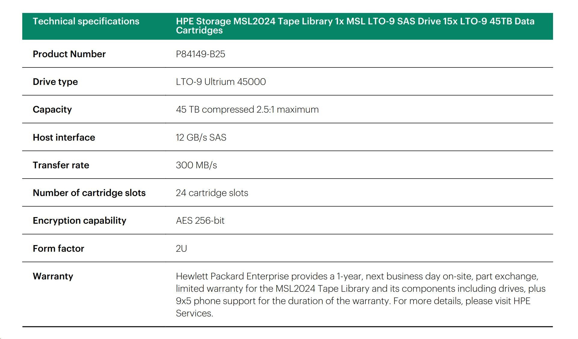 HPE Storage MSL2024 Tape Library 1x MSL LTO-9 SAS Drive 15x LTO-9 45TB Data Cartridges.