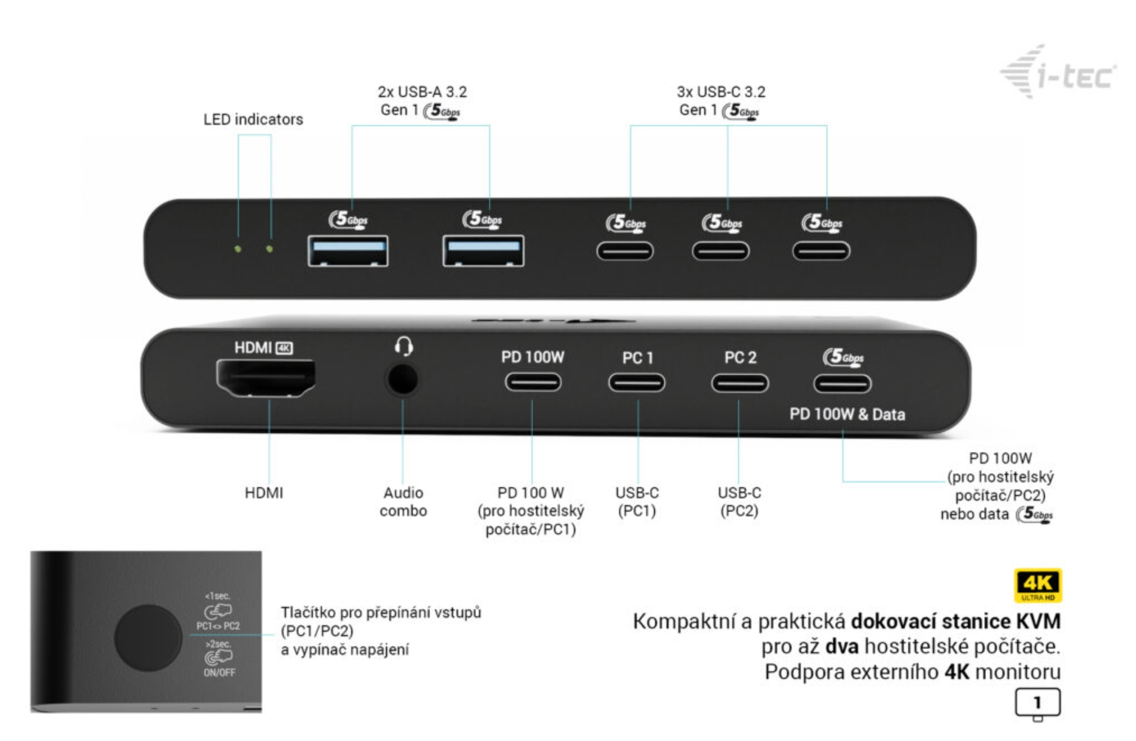 • 2× USB-C porty pro připojení USB-C zařízení (PC1, PC2)