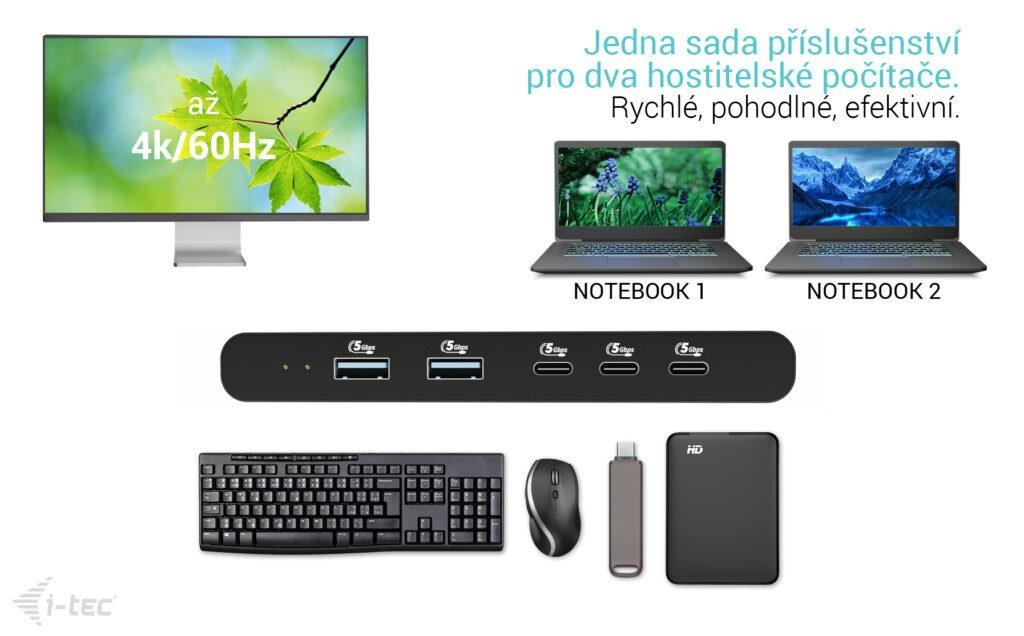 - Jedna sada příslušenství (klávesnice, myš, externí disky) pro oba hostitele – úsporné, efektivní a rychlé