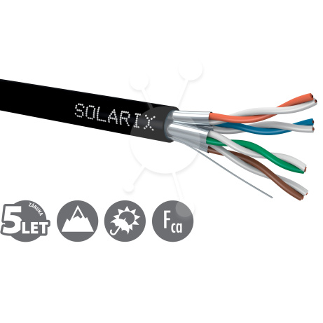 Instalační kabel Solarix s označením SXKD-6A-STP-PE je jvysoce kvalitní stíněný kabel kategorie 6A, který je určený pro provoz vysokorychlostních ethernetových protokolů, včetně 10GBASE-T. Konstrukce kabelu je U/FTP, typ pláště UV stabilní PE s třídou reakce na oheň Fca a stupněm krytí IP67. Vodiče kabelu jsou vyrobeny z kvalitního měděného drátu s čistotou mědi 99,97 %. Kabel bez problémů splňuje požadavky z mezinárodních standardů ISO/IEC 11801, EN 50173 a ANSI/TIA 568.2-D. Stejně jako ostatní kabely Solarix, je i kabel SXKD-6A-STP-PE značen metráží po 1 m v rozsahu od 0 do 500 m. Kabel je dodáván na vysoce pevné dřevěné cívce, na které jsou uvedeny všechny nezbytné produktové informace, včetně čárových kódů, výrobní šarže, popisu a nejdůležitějších technických parametrů. Tento kabel není určen pro trvalé uložení do vody ani do země bez odpovídající řádné ochrany.