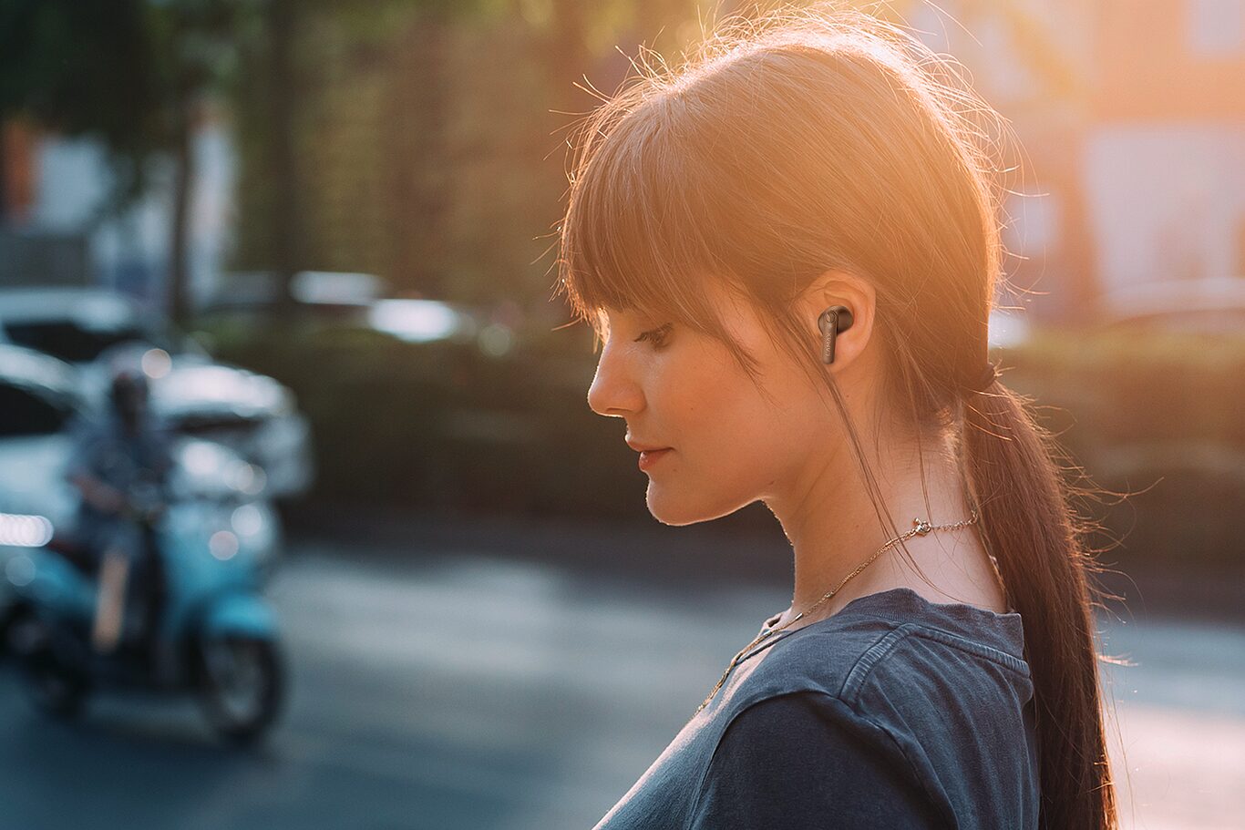 Kompaktní sluchátka s nožičkou skvěle sedí v uchu i ve skladným dobíjecím pouzdru, který se vejde do každý kapsy.