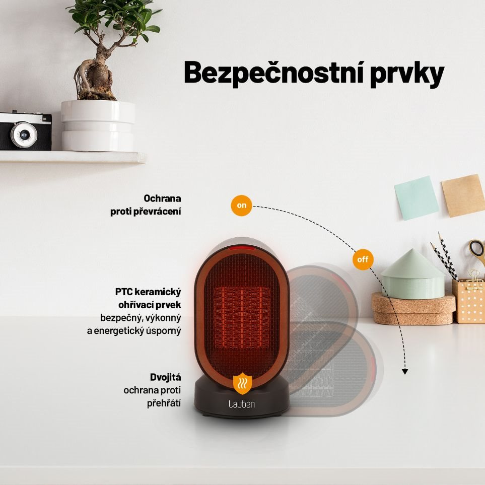 Mini topidlo Lauben Desk Fan&Heater 2in1 600BB představuje skvělé řešení domů, na chatu i do kanceláře pro chvíle, kdy si potřebujete trochu přitopit. Bezpečný provoz zajišťuje PTC keramické topidlo, které zároveň poskytuje energeticky efektivní výkon. Mód topidla poskytuje příjemný teplotní komfort jednoduše a rychle.