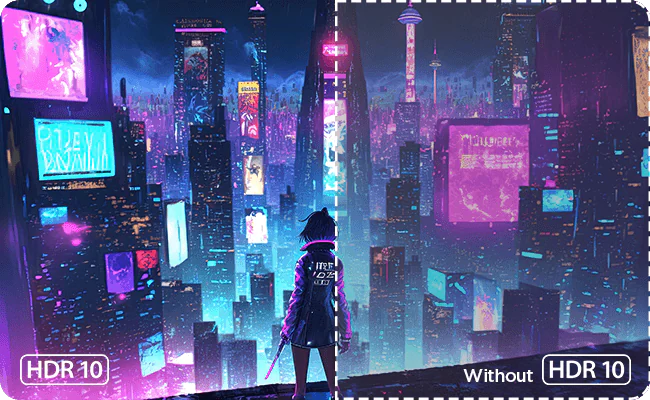 HDR10 vylepšuje herní světy výrazným kontrastem – každé scéně dodává hlubší černou a jasnější bílou barvu pro pohlcující herní zážitek.