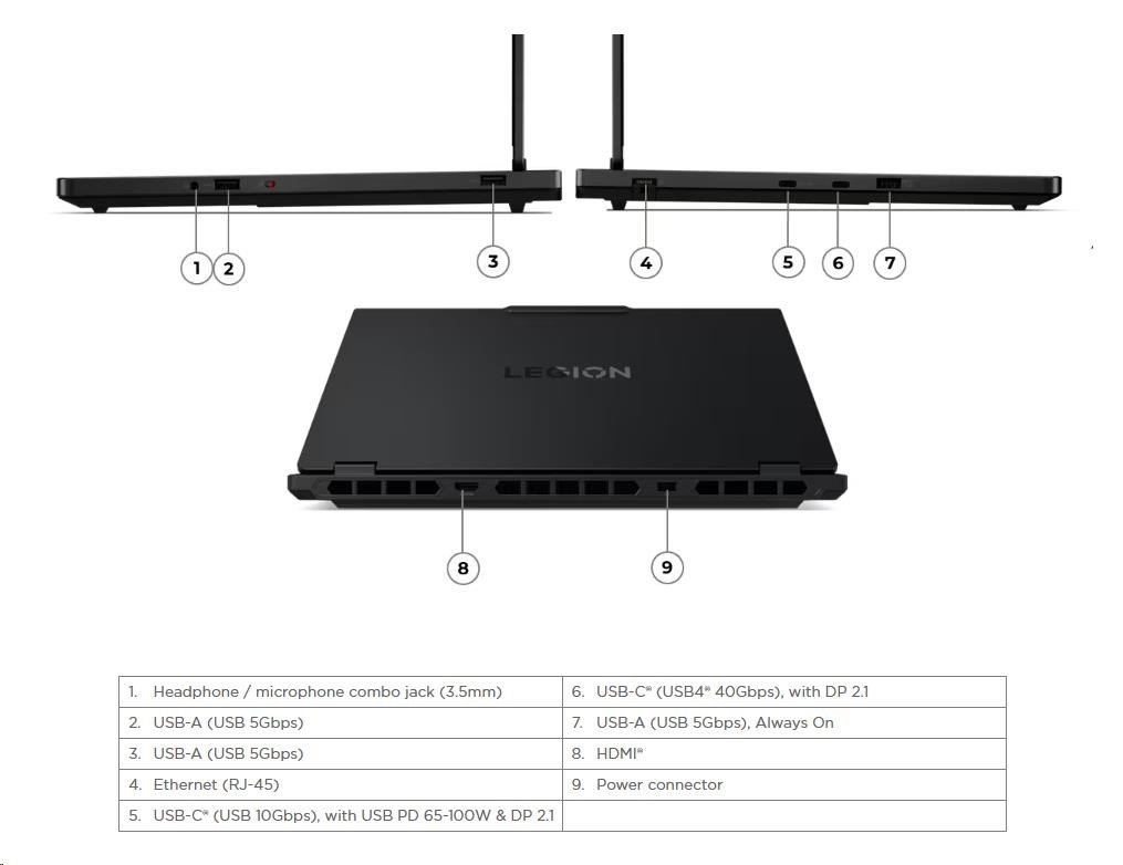 Standartné porty | 2x USB-A (USB 5Gbps / USB 3.2 Gen 1) 1x USB-A (USB 5Gbps / USB 3.2 Gen 1), Always On 1x USB-C® (USB 10Gbps / USB 3.2 Gen 2), with USB PD 65-100W and DisplayPort™ 2.1 1x USB-C® (USB4® 40Gbps), with DP 2.1 1x HDMI® 2.1, up to 8K/60Hz 1x Headphone / microphone combo jack (3.5mm) 1x Ethernet (RJ-45) 1x Power connector |