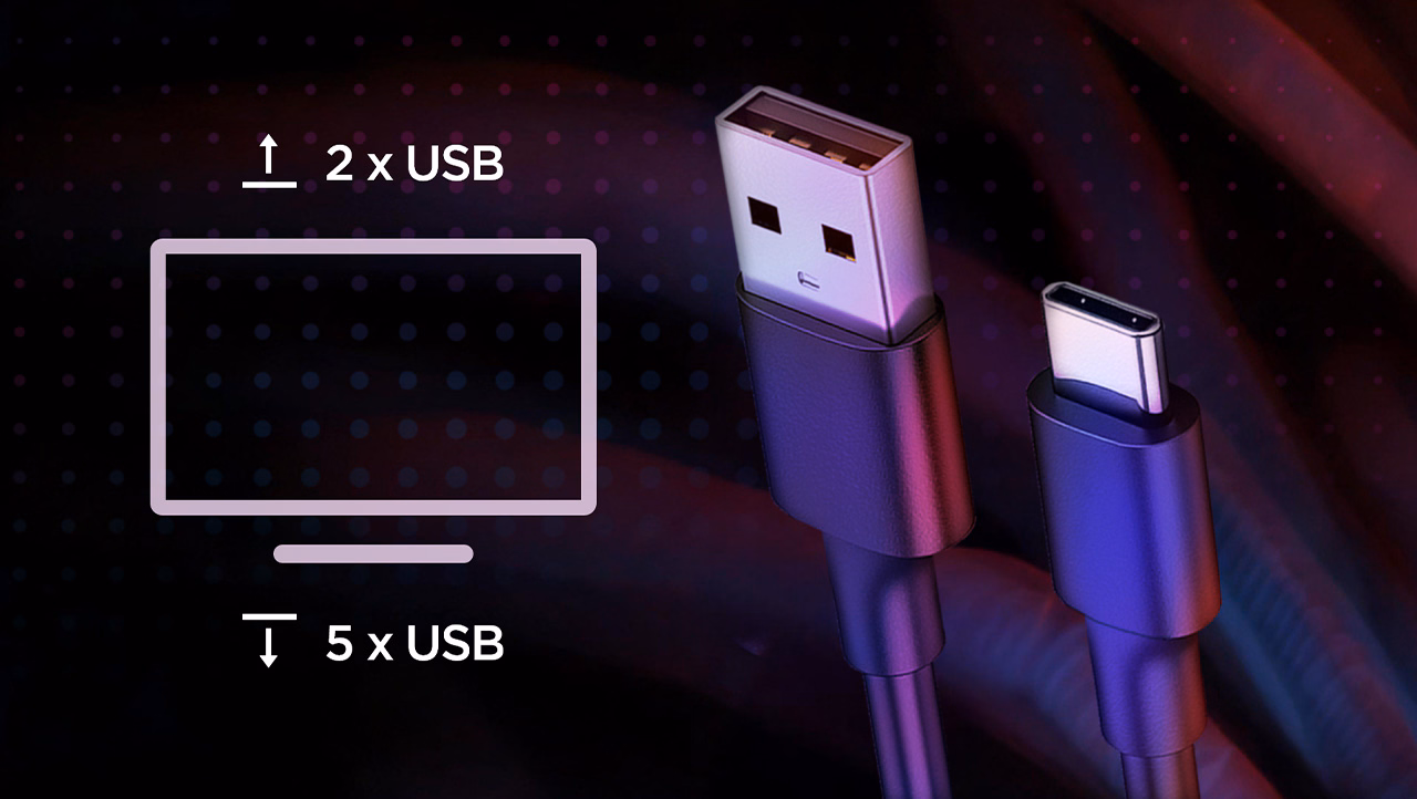 *USB Port: 1× USB-C (10 Gbps, DP 1.4 Alt Mode HBR3, PD 3.1 140 W, USB upstream), 1× USB-B (5 Gbps, USB upstream), 3× USB-A (5 Gbps, USB downstream), 1× USB-A (5 Gbps, s BC1.2, USB downstream), 1× USB-C (5 Gbps, 15 W PD, USB downstream)