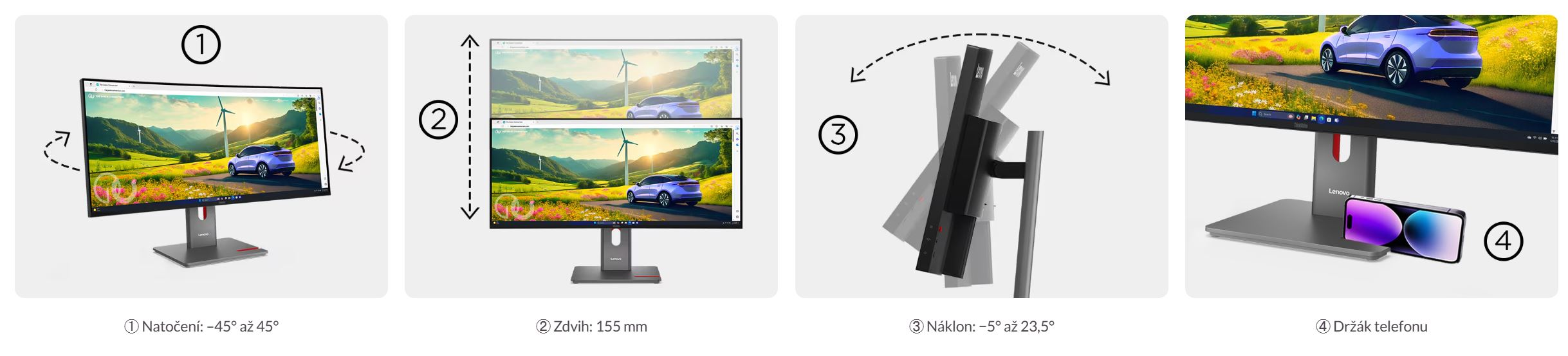 UĹľijte si vylepšenĂ˝ uĹľivatelskĂ˝ zážitek, kterĂ˝ klade dĹŻraz na pohodlĂ a snadnost pouĹľitĂ, s monitorem ThinkVision P34WD-40. ÄŚistšà vedenĂ kabelĹŻ zase šetřà mĂsto a omezuje nepořádek. PlnÄ› nastavitelnĂ˝ ergonomickĂ˝ stojan s širšĂmi rozsahy Ăşprav polohy, vÄŤetnÄ› zdvihu a náklonu, vám umoĹľnĂ umĂstit si monitor tak, abyste pĹ™i práci mÄ›li maximálnĂ pohodlĂ. Model P34WD-40 je takĂ© vybaven držákem telefonu pro vÄ›tšà flexibilitu.