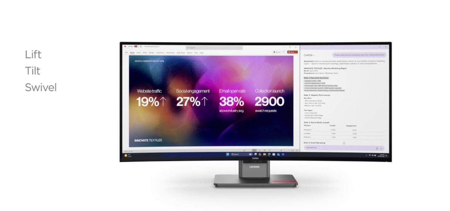 Monitory ThinkVision se vyznaÄŤujĂ promyšlenĂ˝m ergonomickĂ˝m designem a stojanem, kterĂ˝ lze zvedat, naklánÄ›t a otáčet tak, aby vyhovoval vašemu ideálnĂmu stylu práce a drĹľenĂ tÄ›la.