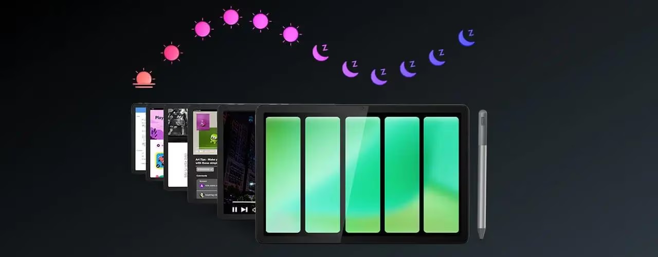 Ponořte se do příběhu na tabletu Tab K11 díky režimu pohlcujícího čtení s ambientní hudbou od společnosti Lenovo. Imersivní čtení, které napodobuje barevnou matrici knihy pomocí chromatického a monochromatického režimu, vám poskytne vítanou přestávku od intenzivního čtení. Navíc díky displeji s certifikací TÜV pro péči o zrak může čtení pokračovat celé hodiny a zároveň chránit oči.