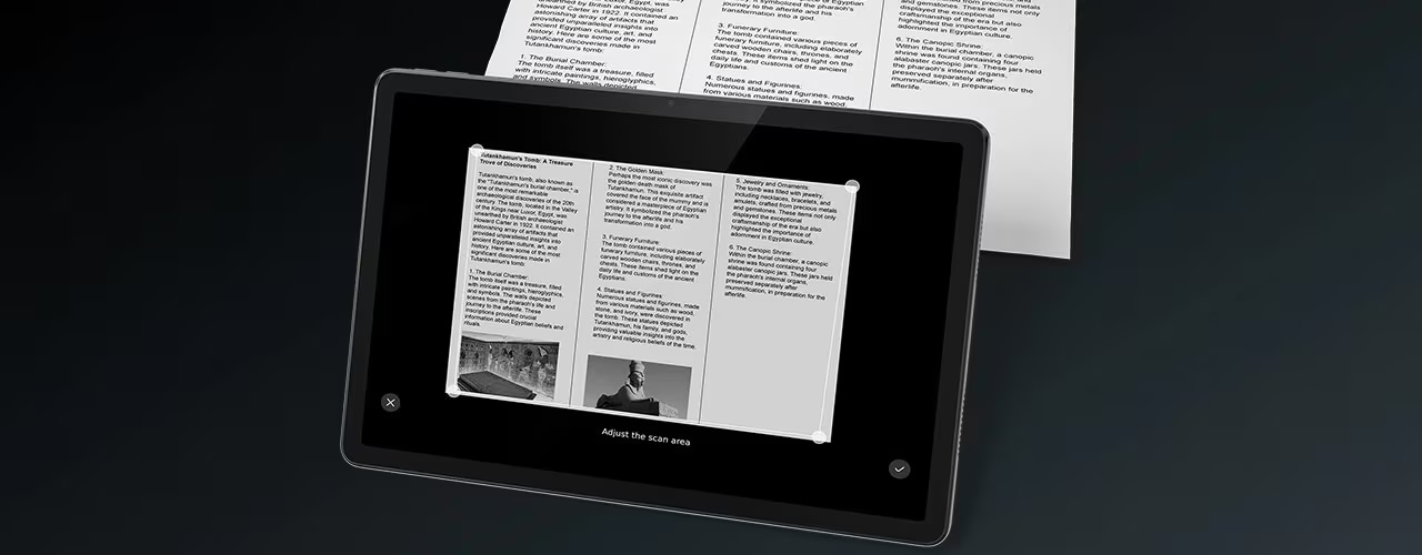 Fotoaparát tabletu Lenovo Tab K11 usnadňuje pořizování dokumentů díky inteligentnímu skeneru, který na několik kliknutí okamžitě převede a opraví obrázky na dokumenty PDF.