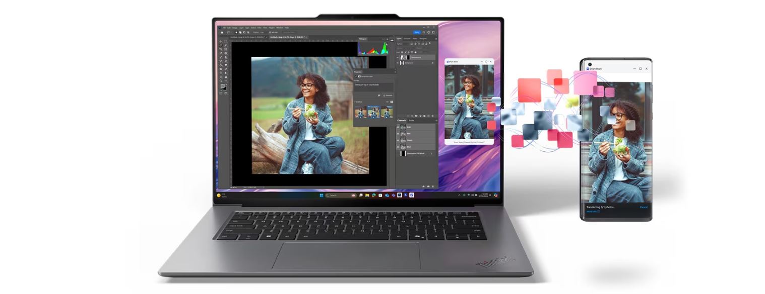 Funkce Smart Share okamĹľitÄ› propojĂ váš chytrĂ˝ telefon s notebookem prostĹ™ednictvĂm virtuálnĂho snĂmaÄŤe s umÄ›lou inteligencĂ. StaÄŤĂ pĹ™iloĹľit zaĹ™ĂzenĂ se systĂ©mem Android™ nebo iOS k notebooku - a pak pĹ™etáhnout. Upravujte fotografie a snadno je sdĂlejte. NavĂc zĂskejte pĹ™Ăstup k textovĂ˝m zprávám a posĂlejte je z poÄŤĂtaÄŤe.